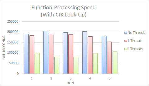 In a sample directory of just over 600 project files, I ran the program 5 times with no threading, one thread and four threads, and then compared the results. Here are the results for running the program without looking up CIKs on the EDGAR System: