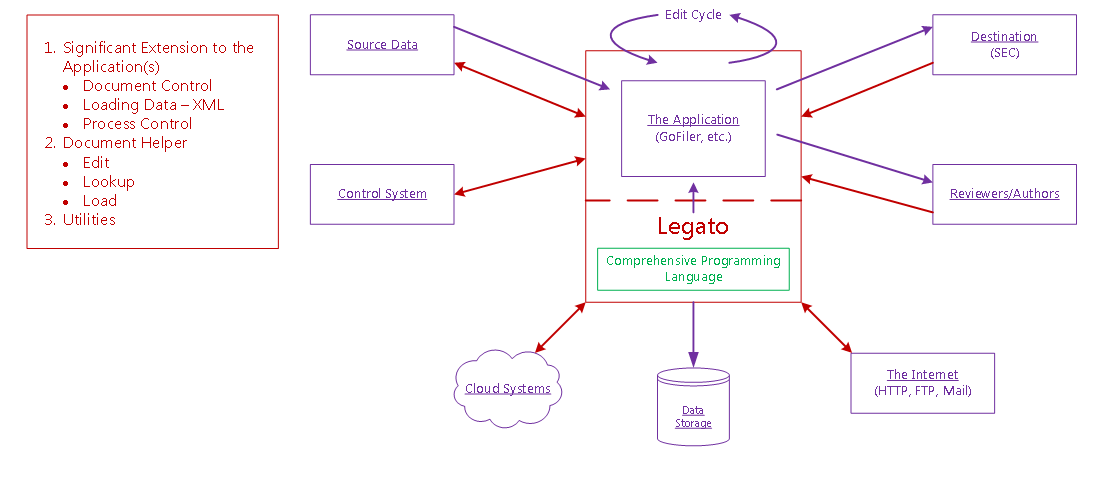 Legato offers a comprehensive programming interface that can wrap around the application and interact with numerous document sources and destinations, including the internet, cloud storage systems, and databases. It can automate aspects of the edit cycle and customize user processes, as well as offer enhanced document control, data loading procedures, and project specific process control. The following charts depict just some of the ways Legato can provide significant extensions to the application.