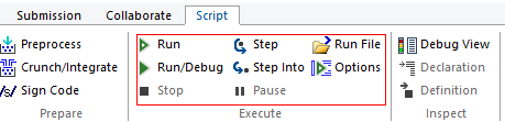 A function has been added to “crunch” code. This IDE function is also available as a script function within the IDE. The function is available from the ribbon as Script | Prepare | Crunch Integrate. The dialog appears as follows:
